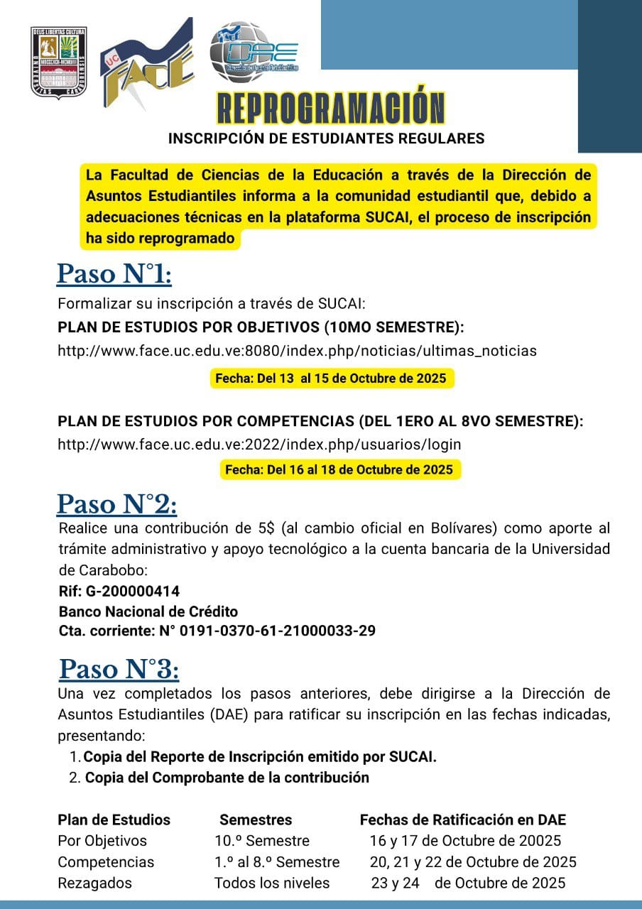 Les recordamos a los estudiantes de la FaCE que  su inscripción, estará disponible por sucai a partir del 04 de noviembre de 2016 a las 12:00 m (debe tener el 100% de las notas de las asignaturas cursadas en el 1-2016 para poder procesar la inscripción)
